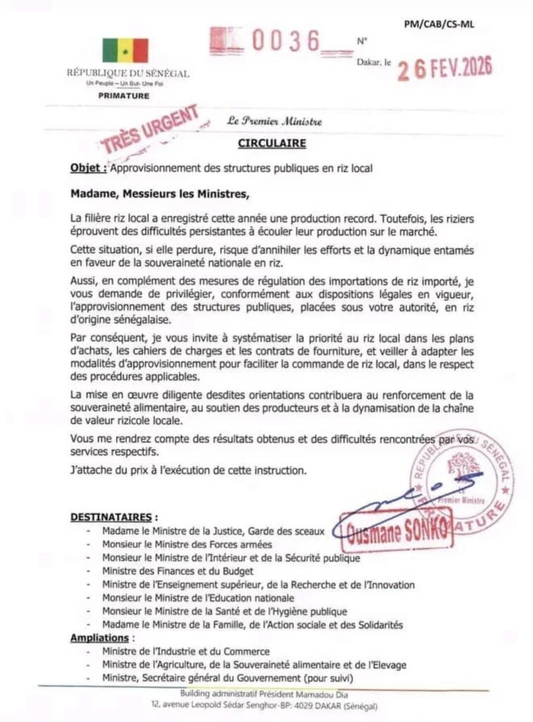 Dans une circulaire adressée aux membres du gouvernement, le Premier ministre Ousmane Sonko demande aux ministres de privilégier l’approvisionnement des structures publiques en riz d’origine sénégalaise. Cette mesure vise à soutenir les producteurs locaux, confrontés à des difficultés d’écoulement malgré une production record cette année.