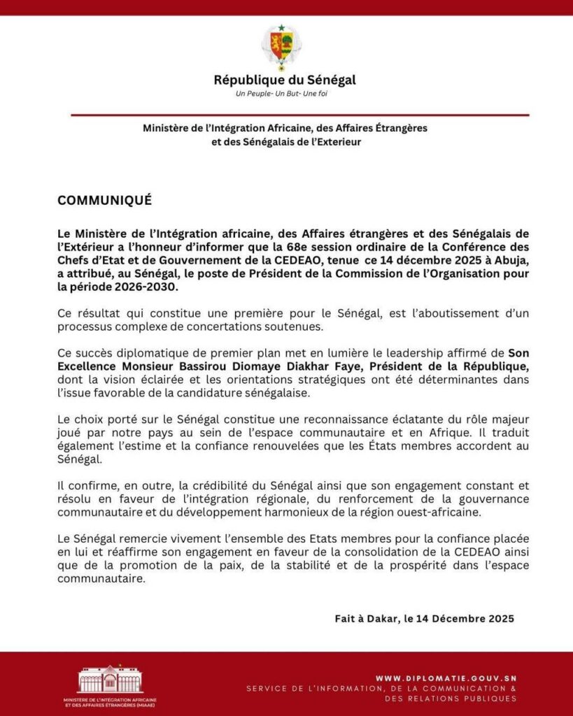 Réunis samedi à Abuja, les chefs d’État et de gouvernement de la Communauté économique des États de l’Afrique de l’Ouest ont confié au Sénégal la direction de la Commission de l’organisation pour la période 2026-2030. L’annonce a été faite dimanche par le ministère de l’Intégration africaine, des Affaires étrangères et des Sénégalais de l’Extérieur, qui parle d’un « succès diplomatique majeur » et d’une première historique pour le pays.