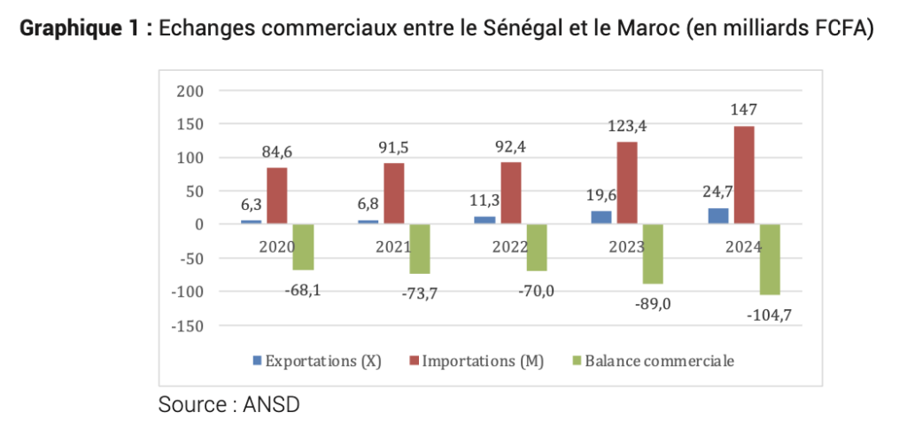 Sur le plan économique, la coopération connaît une dynamique soutenue. En 2024, les exportations sénégalaises vers le Maroc ont atteint 24,7 milliards de FCFA, en hausse de plus de 26 % par rapport à l’année précédente, portées principalement par les produits halieutiques et agroalimentaires. Dans le même temps, les importations en provenance du Maroc se sont établies à 147 milliards de FCFA, dominées par les produits manufacturés et de consommation courante.