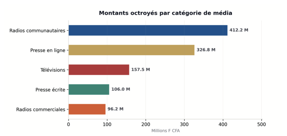 Afin de garantir une certaine équité dans la distribution, des plafonds ont été fixés par type de média. Ils s’établissent à 5 millions FCFA pour les radios communautaires, 25 millions pour la presse écrite, 35 millions pour les radios commerciales, 40 millions pour la presse en ligne et 50 millions pour les télévisions.