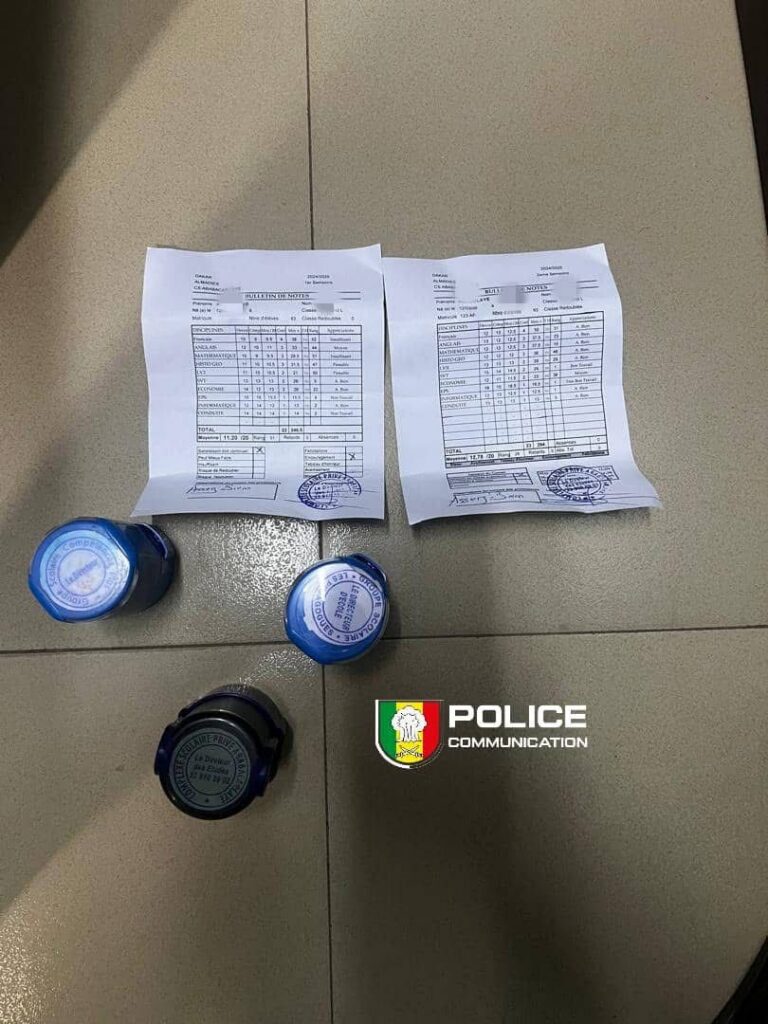 Le document incriminé, présenté par un élève, comportait des incohérences manifestes malgré la présence de cachets et d’une signature contrefaite. Entendu par les enquêteurs, l’élève a reconnu avoir acquis le faux bulletin pour la somme de 15 000 FCFA auprès d’un enseignant, dans le but de tromper les services de vérification.