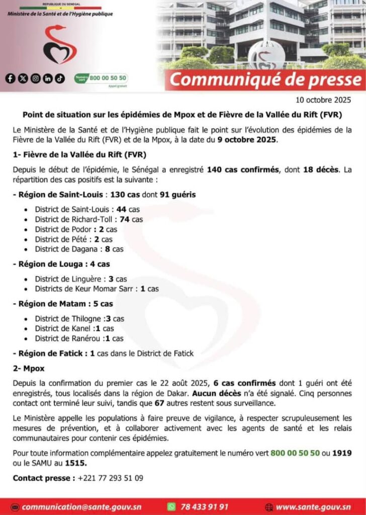 Le ministère de la Santé et de l’Hygiène publique a dressé, ce 10 octobre 2025, un nouveau bilan sur la situation épidémiologique nationale. À la date du 9 octobre, le Sénégal compte 140 cas confirmés de Fièvre de la Vallée du Rift (FVR) et 6 cas de Mpox. Les autorités sanitaires redoublent d’efforts pour contenir la propagation et renforcer la prise en charge des malades.