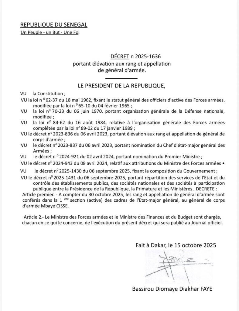 Le Président de la République, Bassirou Diomaye Faye, a élevé, par décret présidentiel en date du 15 octobre 2025, le Général de Corps d’Armée Mbaye Cissé au rang et à l’appellation de Général d’Armée. Cette promotion, qui prendra effet à compter du 30 octobre 2025, marque une étape historique dans la carrière du Chef d’État-major Général des Armées (Cemga).
