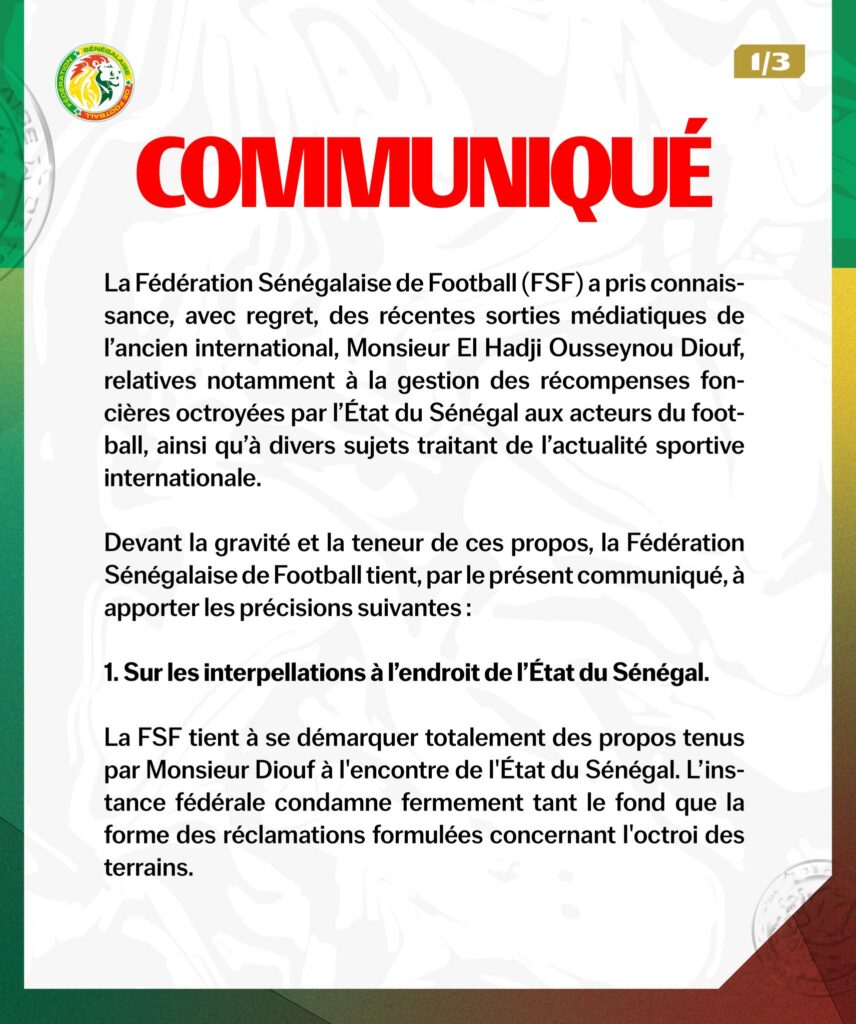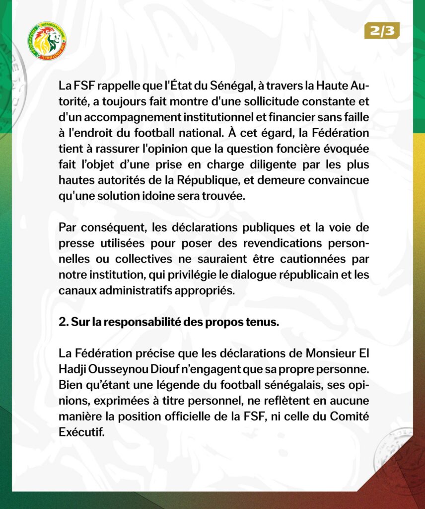 La Fédération tient également à préciser que les déclarations de Monsieur El Hadji Ousseynou Diouf n’engagent que lui. Si son statut de légende du football sénégalais est unanimement reconnu, ses prises de position ne sauraient être assimilées à celles de la FSF ou de son Comité exécutif. Cette mise au point vise à lever toute ambiguïté quant à une éventuelle confusion entre opinion personnelle et position institutionnelle.