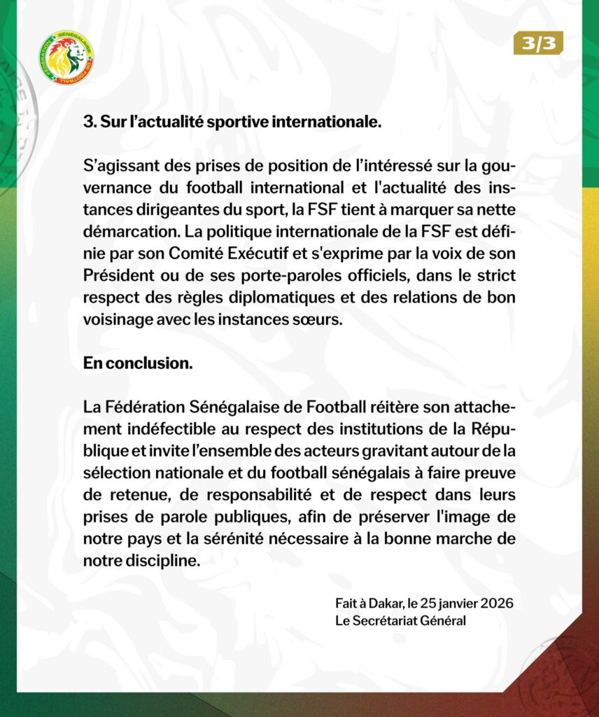 Dans son communiqué, la Fédération condamne fermement les réclamations formulées publiquement à l’endroit de l’État du Sénégal. Elle rappelle que les autorités sénégalaises ont, de manière constante, accompagné le football national aussi bien sur le plan institutionnel que financier.