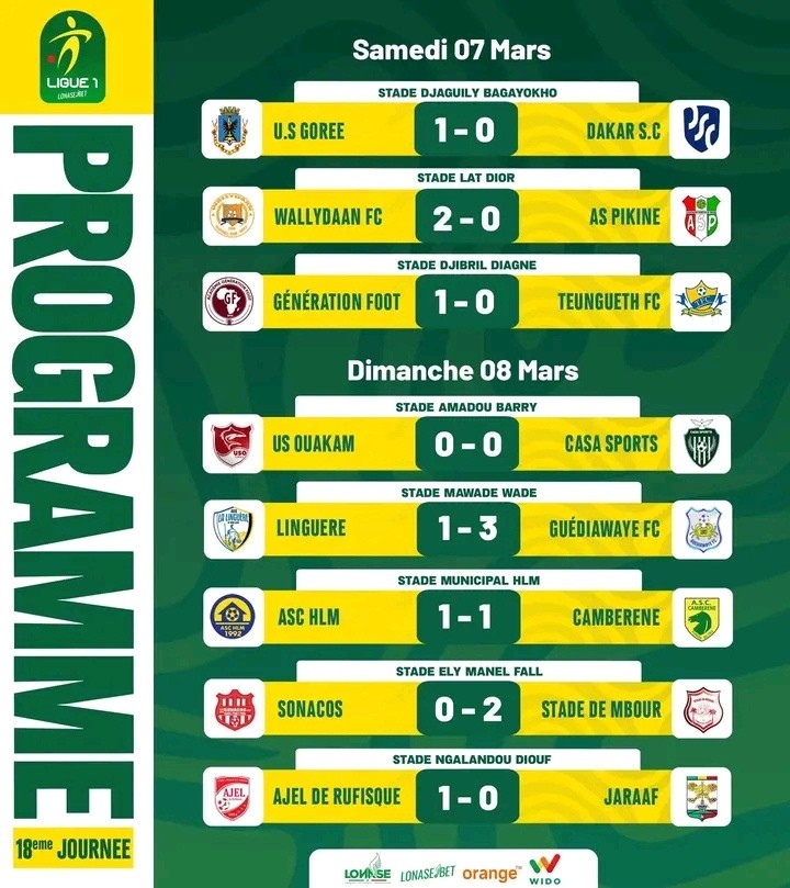 Dans les autres rencontres de cette 18e journée, l’US Ouakam et le Casa Sports se sont neutralisés (0-0), tandis que HLM Dakar et l’ASC Cambérène ont partagé les points (1-1).
