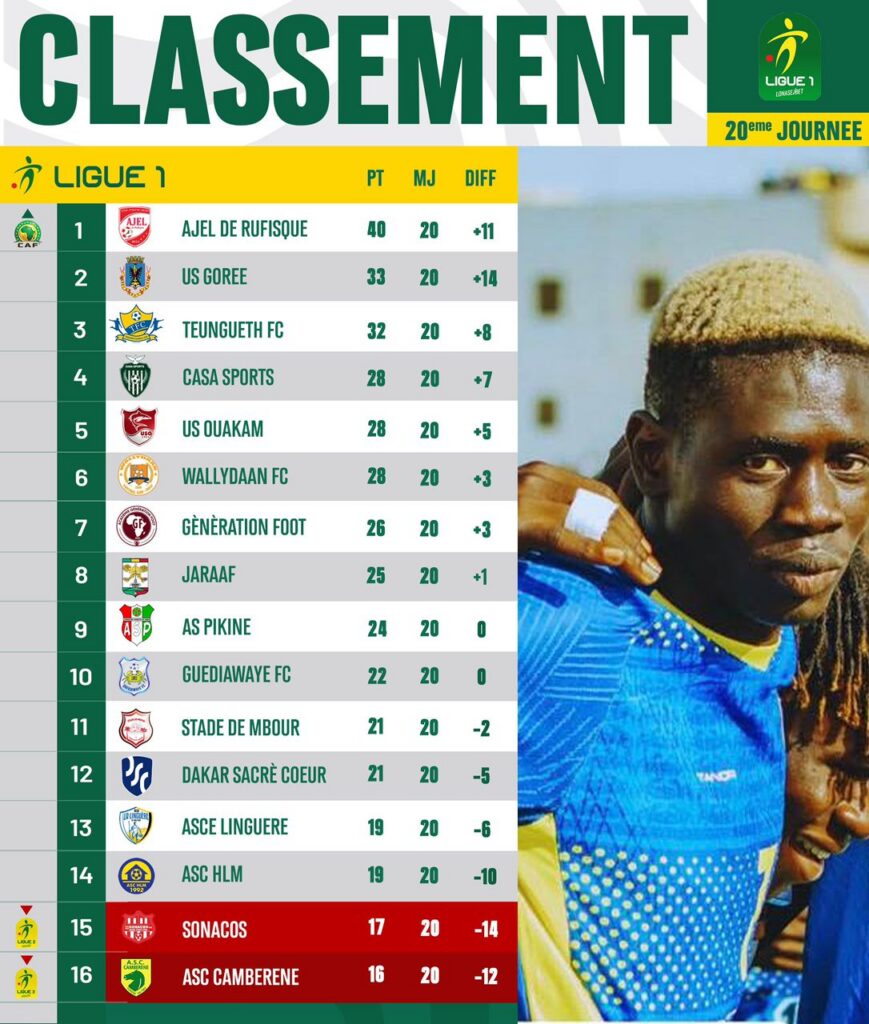 Plus bas, l’US Ouakam poursuit sa dynamique positive avec une courte victoire (1-0) contre HLM, tandis que le Jaraaf met fin à une longue disette en dominant le Stade de Mbour (2-0), signant ainsi son premier succès de l’année.