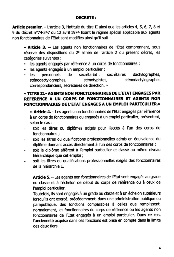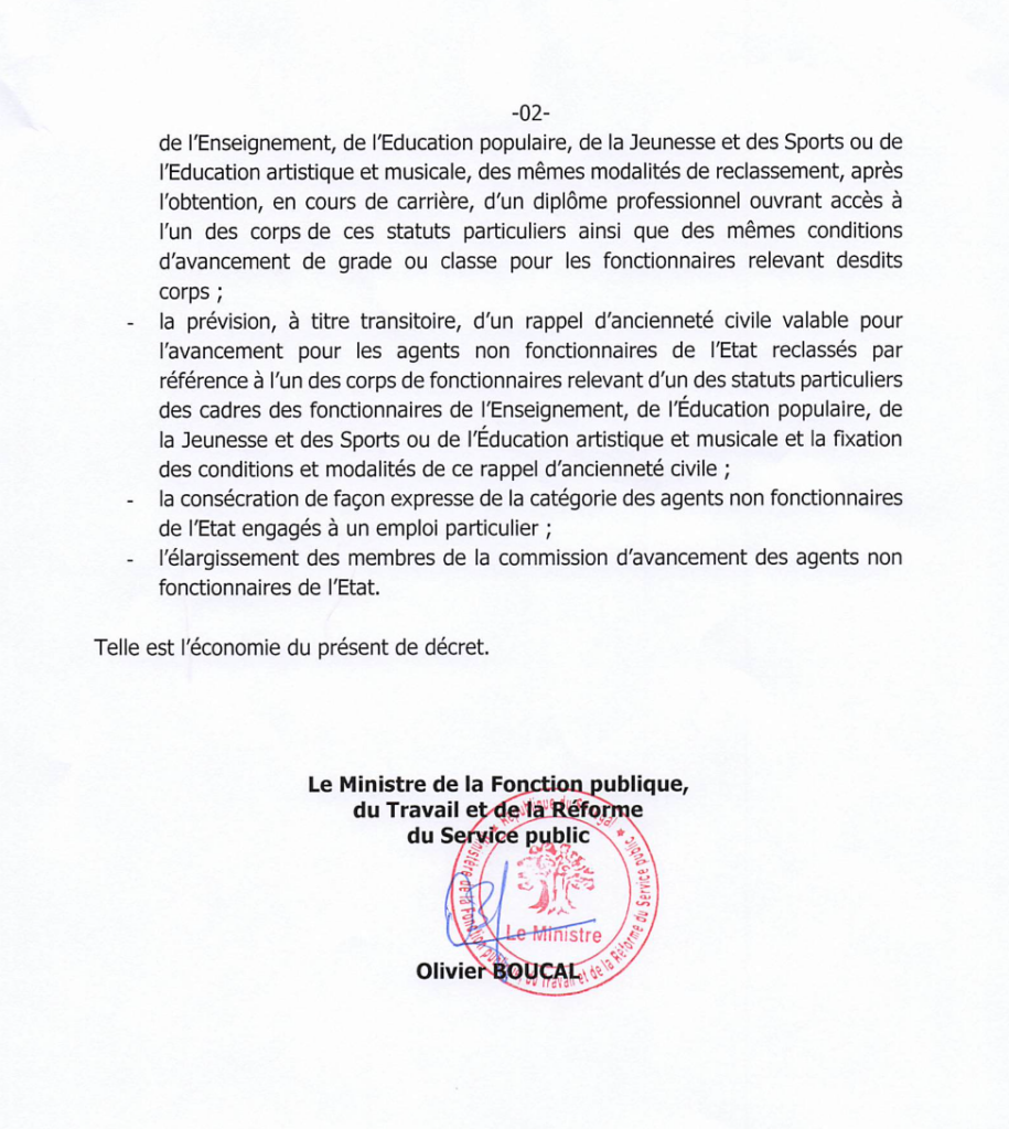 Selon le rapport de présentation du ministre de la Fonction publique, du Travail et de la Réforme du Service public, Olivier Boucal, l’ancien cadre réglementaire comportait plusieurs insuffisances notables. Parmi celles-ci figuraient l’absence de reconnaissance formelle des agents engagés à un emploi particulier, ainsi que le manque de dispositions claires sur l’avancement des agents non fonctionnaires référencés aux corps de l’Enseignement, de l’Éducation populaire, de la Jeunesse et des Sports.