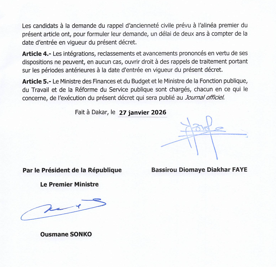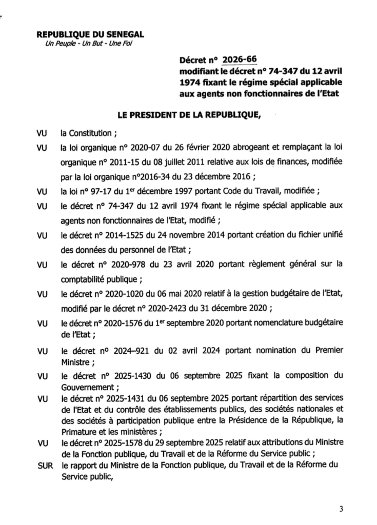 Le gouvernement du Sénégal a adopté le décret n° 2026-66 modifiant le régime spécial applicable aux agents non fonctionnaires de l’État. Le texte, signé mardi par le président Bassirou Diomaye Diakhar Faye et contresigné par le Premier ministre Ousmane Sonko, marque une réforme majeure touchant plusieurs milliers d’agents publics.