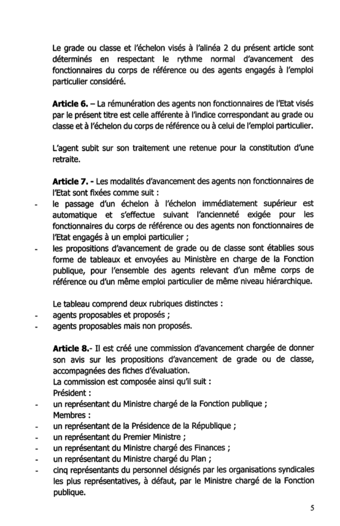 Le texte prévoit par ailleurs la mise en place d’une commission d’avancement chargée d’examiner les propositions d’évolution de grade ou de classe. Présidée par un représentant du ministre chargé de la Fonction publique, cette instance regroupe des représentants de la Présidence de la République, de la Primature, des ministères des Finances et du Plan, ainsi que cinq représentants syndicaux. Les avancements seront accordés dans la limite de 50 % des agents promouvables relevant d’un même corps ou d’un même emploi particulier.