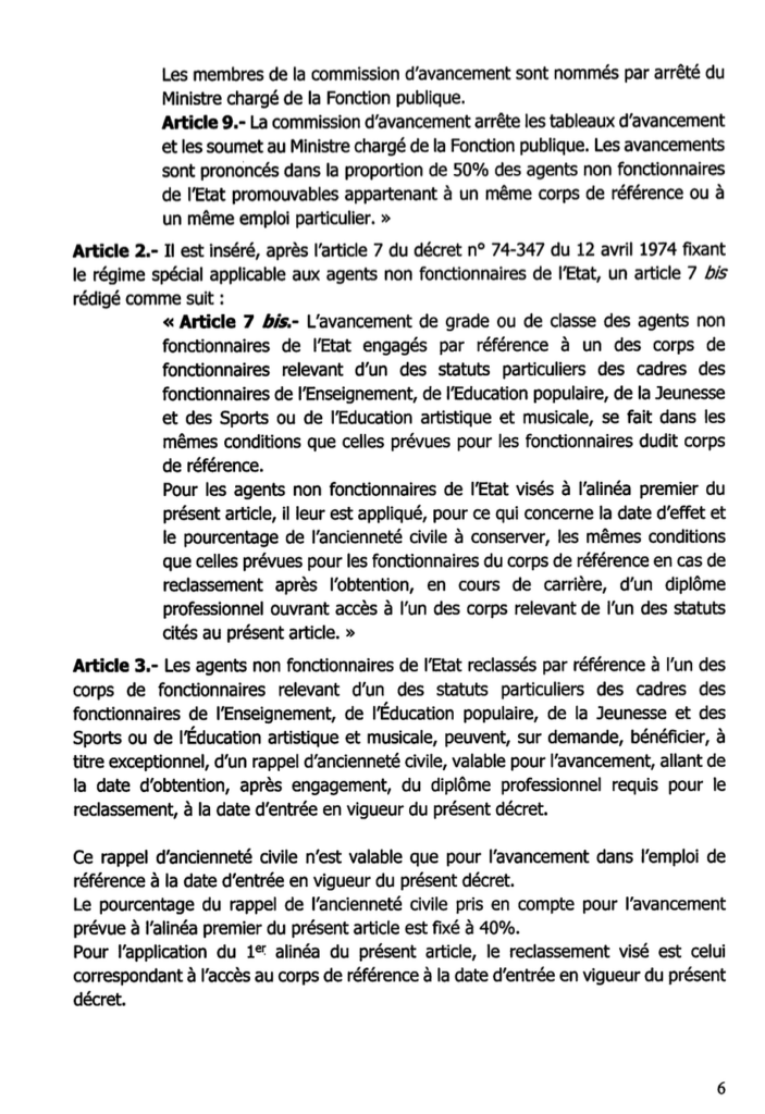 Autre avancée notable : les agents non fonctionnaires référencés aux corps de l’Enseignement bénéficient désormais des mêmes modalités de reclassement et de conditions d’avancement que les fonctionnaires titulaires, sous réserve de l’obtention d’un diplôme professionnel.