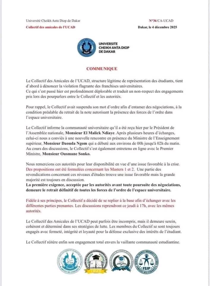 Les discussions reprennent ce jeudi, toujours sous la médiation du Président de l’Assemblée nationale et avec la participation du ministère de l’Enseignement supérieur. Le Collectif des Amicales souligne sa volonté de dialogue et réaffirme sa disponibilité à travailler avec les autorités pour une solution durable dans l’intérêt des étudiants.