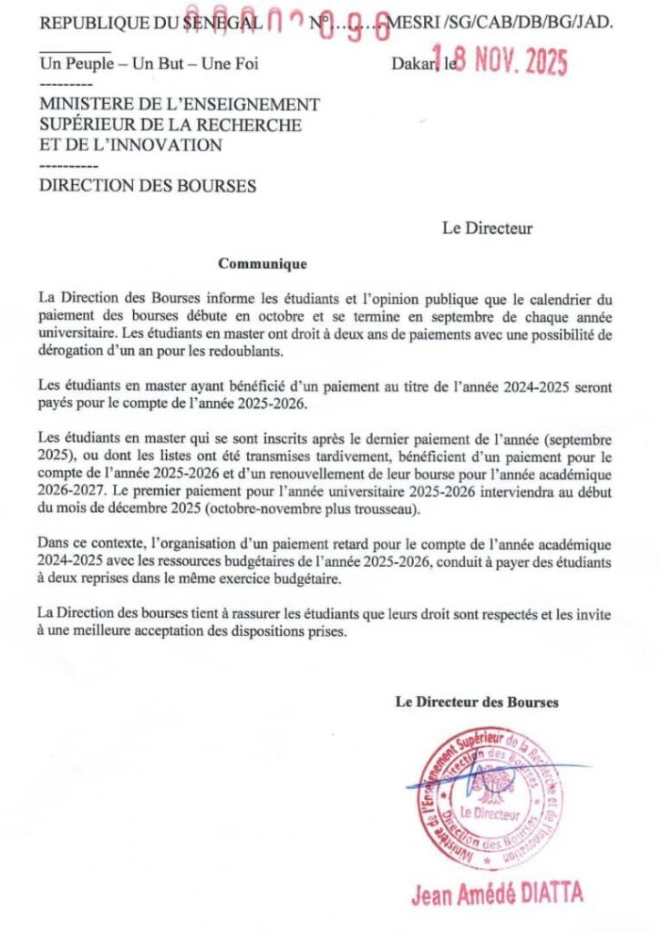 Après deux jours de mouvements d’humeur sur le campus de l’Université Cheikh Anta Diop de Dakar, la Direction des bourses du ministère de l’Enseignement supérieur, de la Recherche et de l’Innovation a publié, ce mardi 18 novembre 2025, un communiqué apportant des précisions sur le décalage observé dans le paiement des allocations universitaires. L’objectif affiché : apaiser les inquiétudes et rétablir un cadre clair pour l’ensemble des étudiants, en particulier ceux inscrits en master.